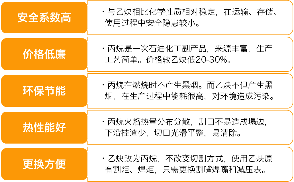 在切割焊接等工藝中,丙烷和乙炔都是常用的可燃?xì)怏w。然而在具體實踐中,丙烷因其安全、綠色、高效、性價比高等特點,逐漸成為工業(yè)用戶的首選氣體,大有取代乙炔之勢。與乙炔等氣體相比,丙烷具有多種優(yōu)勢: